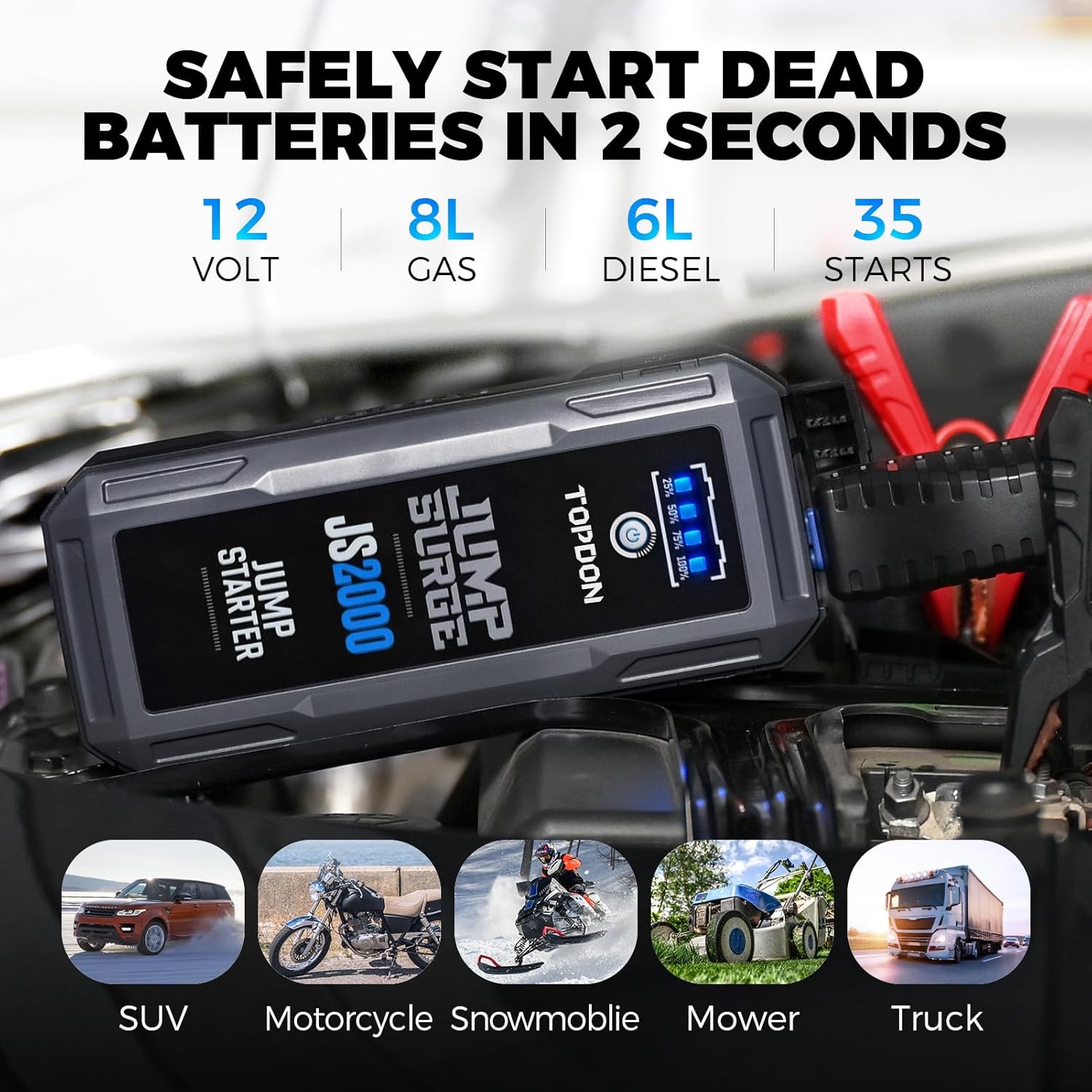 • Massive 2000 Peak Amps ➤ The JumpSurge 2000 car jump starter can deliver 2000 peak amps to restart 12V batteries (8.0L gasoline and 6.0L diesel engines) in 3 seconds. It supports quick and safe jumpstarts for cars, trucks, motorcycles, yachts, lawnmowers, ATVs, SUVs, snowmobiles, and even boats – up to 35 times on a single charge. Whether in extremely cold or extremely hot desert climates, all 12V vehicles can start safely. Never be without power on the road!