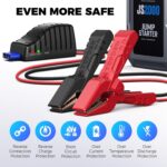 JS2000 car battery jump starter boasts multi built-in smart-protections against reverse polarities, short circuits, overcurrents, and more. These well-rounded safety features protect the user, the car, and the jump starter tool from any damage while operating. What’s more, the cable is 8AWG and clips are well-made with strong springs.