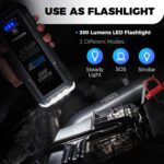 • Super Safe to Use ➤ Alongside a UL2734 certification,this car battery jump starter boasts 10 built-in smart-protections against reverse polarities, short circuits, overcurrents, and more. These well-rounded safety features protect the user, the car, and the jump starter tool from any damage while operating. It can work in temperatures between 14°F ~104°F thanks to its revolutionary Stop Spark sensor. The LED indicator will blink to warn users when the product is being misused to prevent damage.