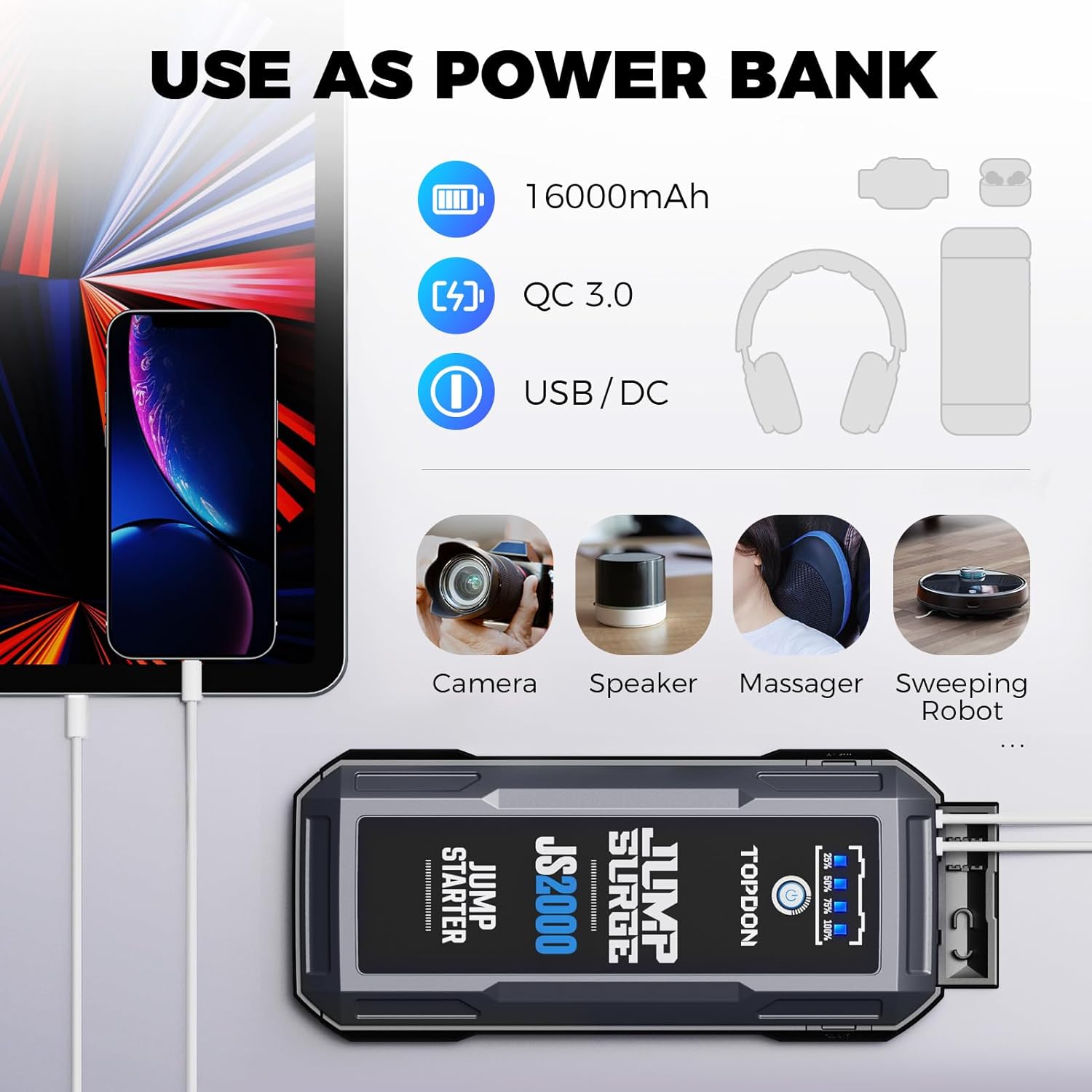 • 300 Lumens LED Flashlight & Backup Power Bank ➤ The JS2000 is a 3-in-1 tool that works as a car starter, a portable power bank, and an LED flashlight. It has versatile outputs (QC 3.0, 5V/2A USB, 12V/10A DC), ideal for charging your USB devices (phone 4 times, iPad 2 times, headphones 35 times). It is capable of powering 12V in-car appliances. The built-in 300 lumens LED flashlight features 3 modes: Steady Light, SOS, and Strobe, so you are prepared to deal with unexpected emergencies at night.