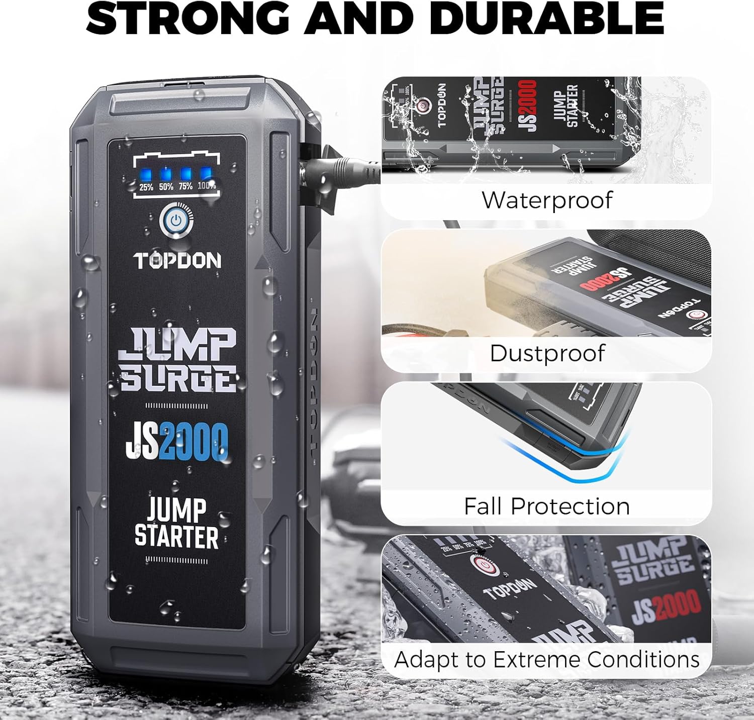 Its working temperature ranges from 14℉ ~ 104℉ (-10℃ ~ 40℃), allowing you to jump-start under the most extreme weather conditions. Don’t worry about getting stranded under any circumstances with the JS2000.